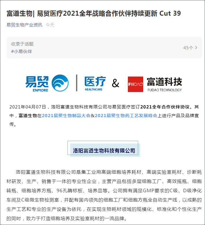2021年04月07日,洛阳富道生物科技有限公司与易贸医疗签订2021全年合作伙伴协议。易贸医疗是中国医药医疗领域领先的专业会议组织者,此次双方达成合作意味着富道生物的产品专业度得到了业内的认可,接下来,公司将在2021易贸生物制品大会&2021易贸生物药工艺发展峰会上与诸多业内同仁做更多的行业交流与探讨,助力行业更好发展。