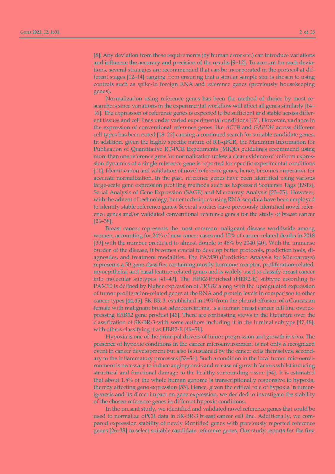 Normalization of gene expression using internal controls or reference genes (RGs) has been the method of choice for standardizing the technical variations in reverse transcription quantitative polymerase chain reactions (RT-qPCR). Conventionally, ACTB and GAPDH have been used as reference genes despite evidence from literature discouraging their use. Hence, in the presentstudy we identified and investigated novel reference genes in SK-BR-3, an HER2-enriched breastcancer cell line. Transcriptomic data of 82 HER2-E breast cancer samples from TCGA database were analyzed to identify twelve novel genes with stable expression. Additionally, thirteen RGs from the literature were analyzed. The expression variations of the candidate genes were studied over five successive passages (p) in two parallel cultures S1 and S2 and in acute and chronic hypoxia using various algorithms. Finally, the most stable RGs were selected and validated for normalization of the expression of three genes of interest (GOIs) in normoxia and hypoxia. Our results indicate that HSP90AB1, DAD1, PFN1 and PUM1 can be used in any combination of three (triplets) for optimiz。ing intra- and inter-assay gene expression differences in the SK-BR-3 cell line. Additionally, we discourage the use of conventional RGs (ACTB, GAPDH, RPL13A, RNA18S and RNA28S) as internal controls for RT-qPCR in SK-BR-3 cell line.