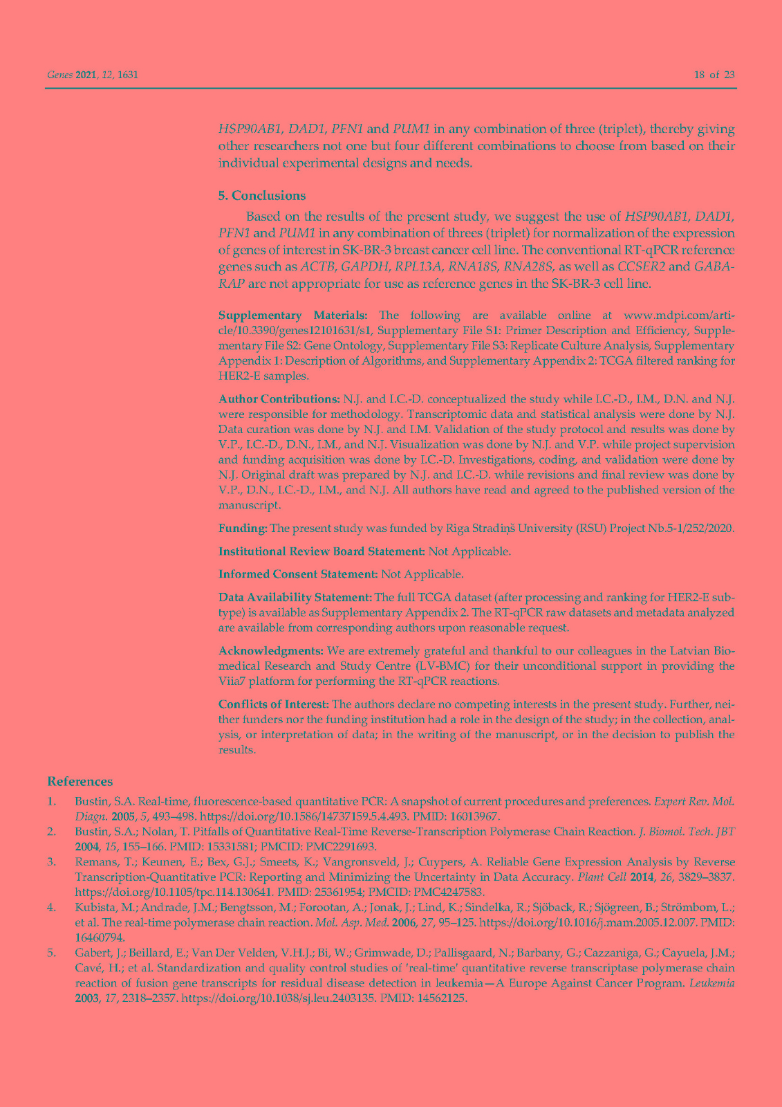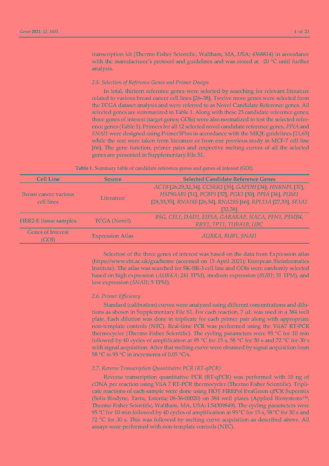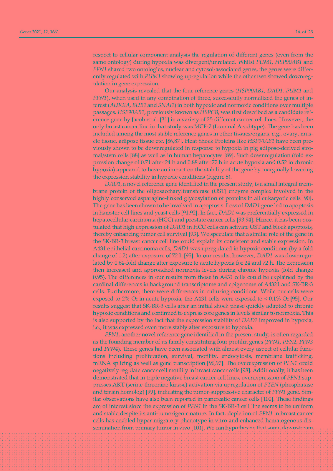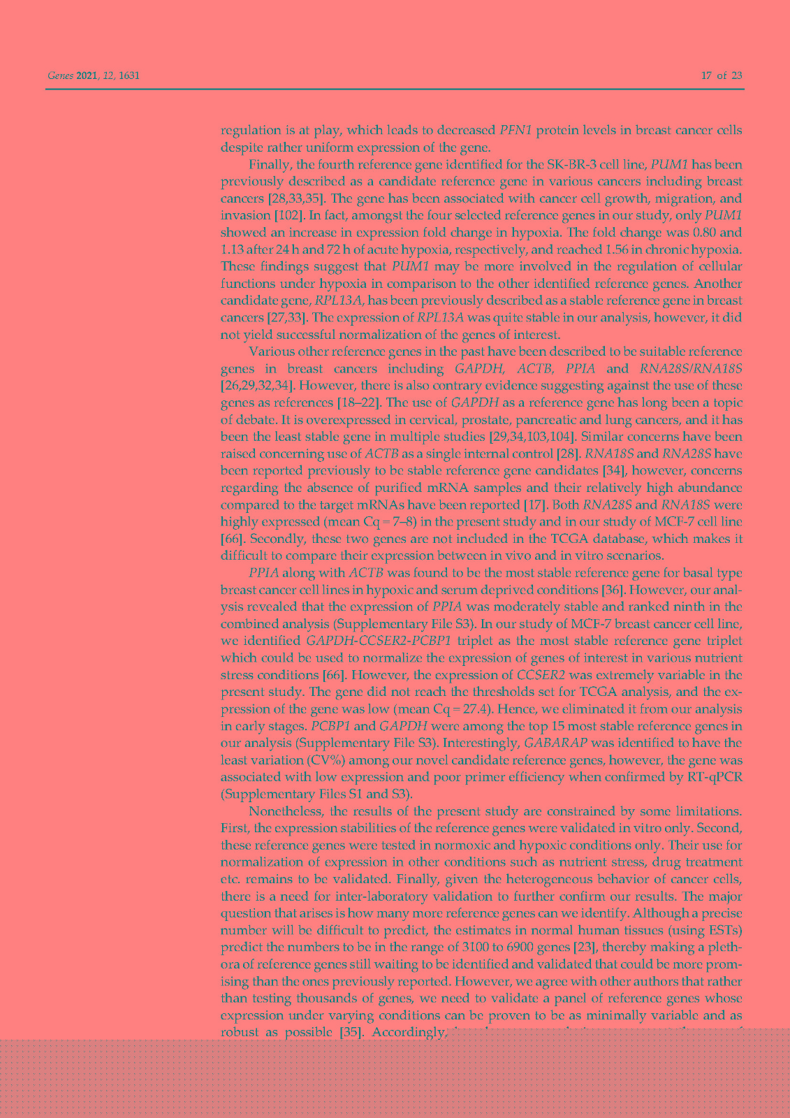 使用内部对照或参考基因 (RG) 对基因表达进行标准化已成为标准化逆转录定量聚合酶链反应 (RT-qPCR) 技术变化的首选方法。传统上,ACTB和GAPDH尽管文献中的证据不鼓励使用它们,但已被用作参考基因。因此,在本研究中,我们在富含 HER2 的乳腺癌细胞系 SK-BR-3 中鉴定并研究了新的参考基因。对来自 TCGA 数据库的 82 个 HER2-E 乳腺癌样本的转录组数据进行了分析,以确定十二个具有稳定表达的新基因。此外,还分析了文献中的 13 个 RG。在两个平行培养物 S1 和 S2 中以及在急性和慢性缺氧条件下,使用各种算法研究了候选基因的表达变化超过 5 次连续传代 (p)。最后,选择最稳定的 RGs 并验证其在常氧和缺氧条件下三个感兴趣基因 (GOI) 的表达正?;?。我们的结果表明HSP90AB1、DAD1、PFN1和PUM1可用于三个(三联体)的任意组合,以优化 SK-BR-3 细胞系中检测内和检测间的基因表达差异。此外,我们不鼓励使用传统的 RG(ACTB、GAPDH、RPL13A、RNA18S和RNA28S)作为 SK-BR-3 细胞系中 RT-qPCR 的内部对照。