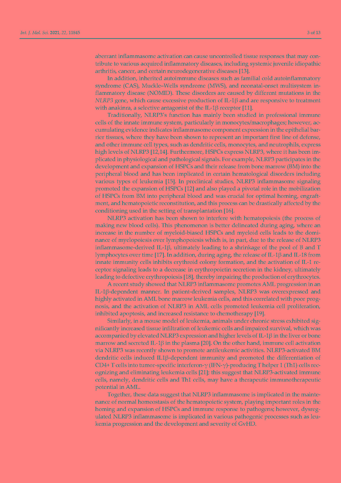 NLR family pyrin domain-containing 3 (NLRP3) is an intracellular protein that after recognizing a broad spectrum of stressors, such as microbial motifs and endogenous danger signals, promotes the activation and release of the pro-inflammatory cytokines IL-1β and IL-18, thus playing an essential role in the innate immune response. Several blood cell types, including macrophages, dendritic cells, and hematopoietic stem and progenitor cells (HSPCs), express NLRP3, where it has been implicated in various physiological and pathological processes. For example, NLRP3 participates in the development and expansion of HSPCs, and their release from bone marrow into the peripheral blood has been implicated in certain hematological disorders including various types of leukemia.