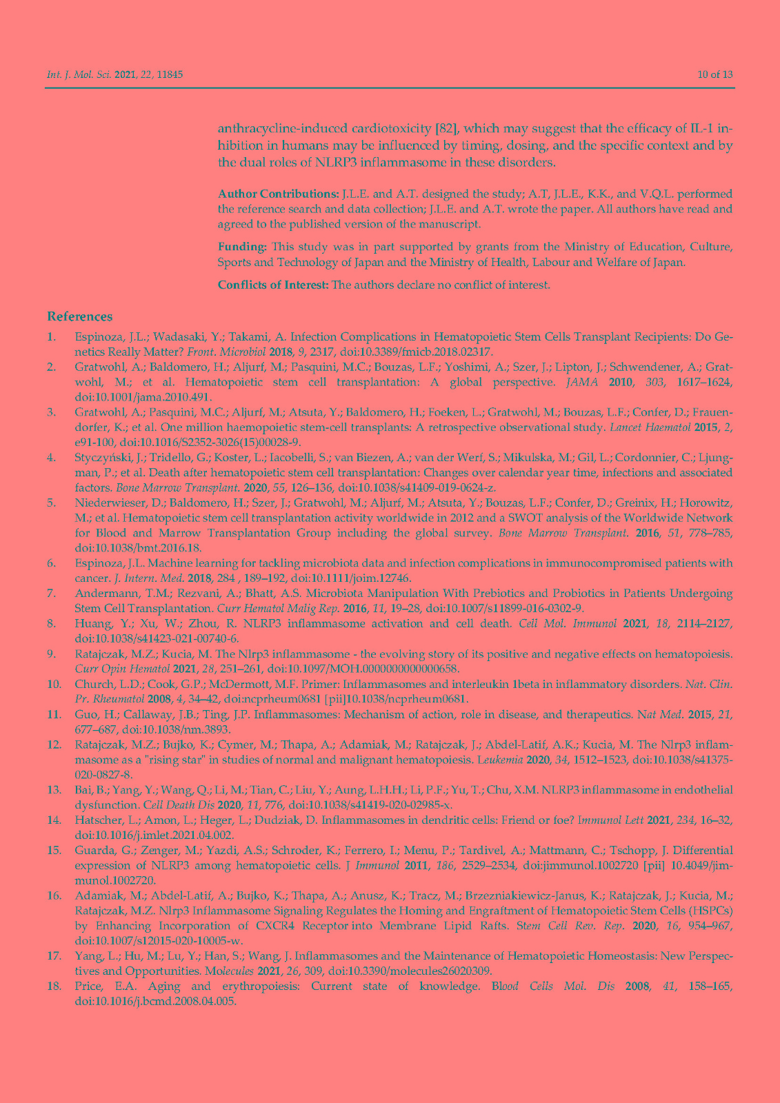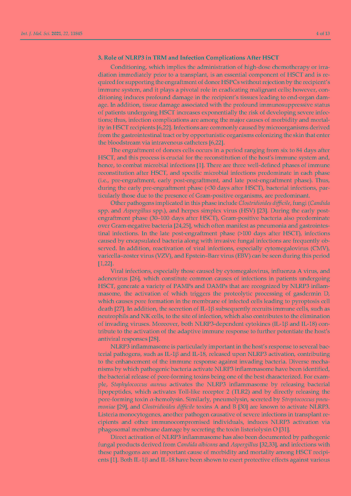 In addition, accumulating evidence indicates that activation of NLRP3 plays a pivotal role in the development of transplant complications in patients receiving hematopoietic stem cell transplantation (HSCT) including graft versus host disease, severe infections, and transplant-related mortality. The majority of these complications are triggered by the severe tissue damage derived from the conditioning regimens utilized in HSCT which, in turn, activates NLRP3 and, ultimately, promotes the release of proinflammatory cytokines such as IL-1β and IL-18. Here, we summarize the implications of NLRP3 in HSCT with an emphasis on the involvement of this inflammasome component in transplant complications.