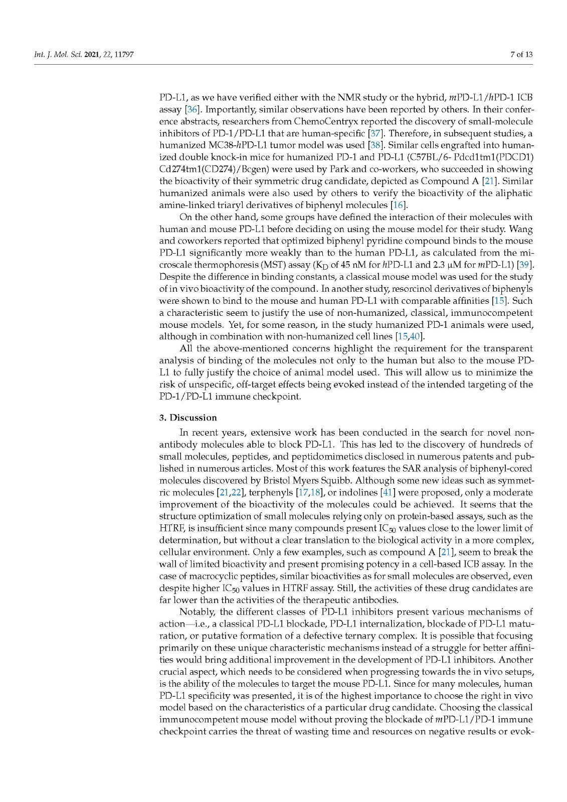 靶向程序性细胞死亡蛋白 1/程序性细胞死亡 1 配体 1 (PD-1/PD-L1) 相互作用已成为癌症免疫治疗的既定策略。尽管近年来提出了数百种小分子、肽和拟肽抑制剂,但只有少数候选药物在基于细胞的检测中显示出良好的 PD-1/PD-L1 阻断活性。在本文中,我们根据 HTRF 测量的 PD-1/PD-L1 解离能力和免疫检查点阻断 (ICB) 共培养测定确定的体外生物活性比较了来自不同类别的代表性分子。我们指出最近的发现强调了这些分子作用机制的重要差异,也表明了一个需要考虑的主要特征,即最终的人类 PD-L1 特异性。