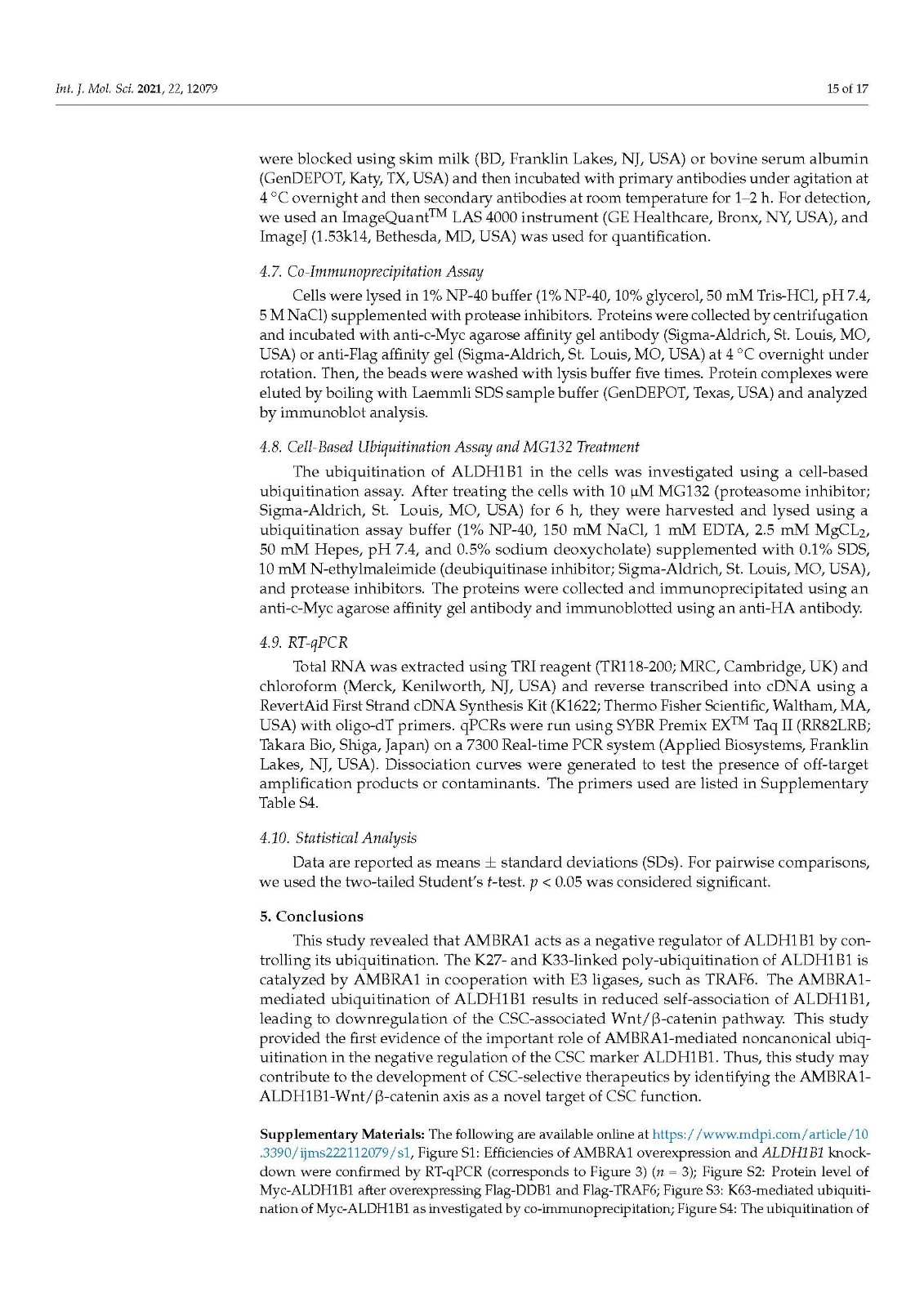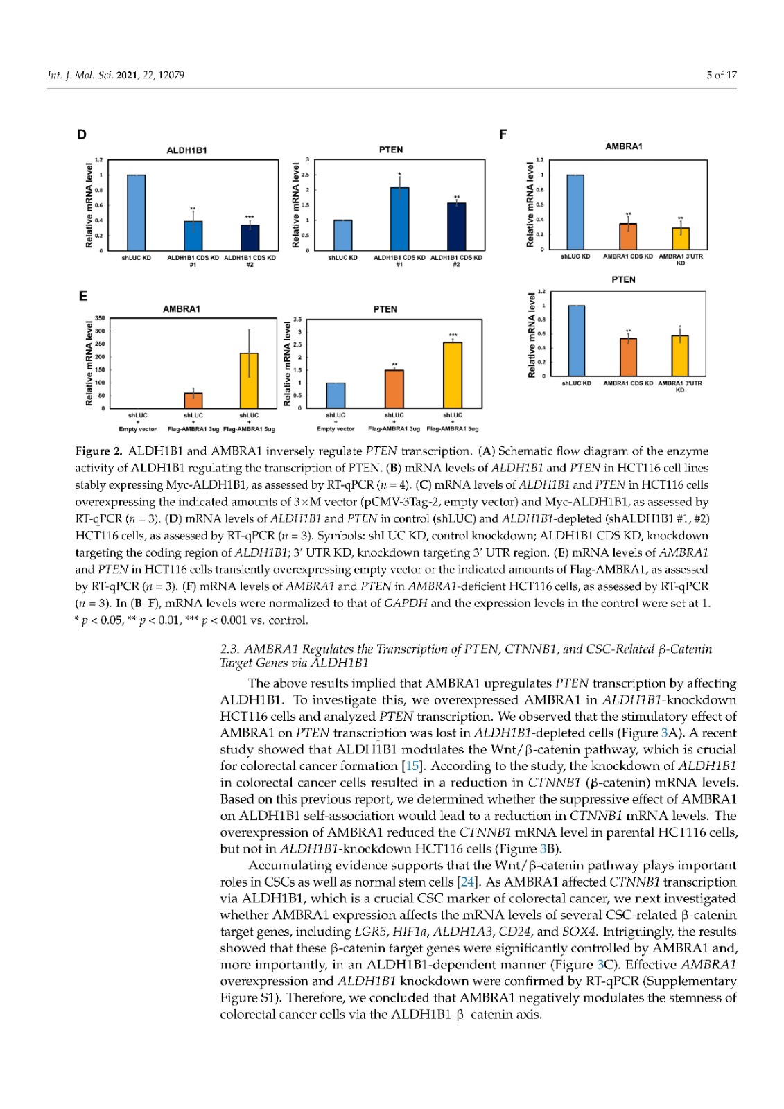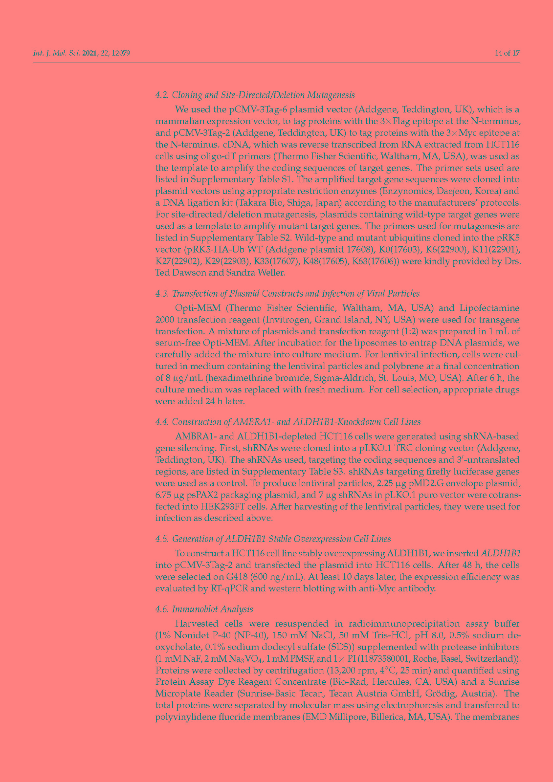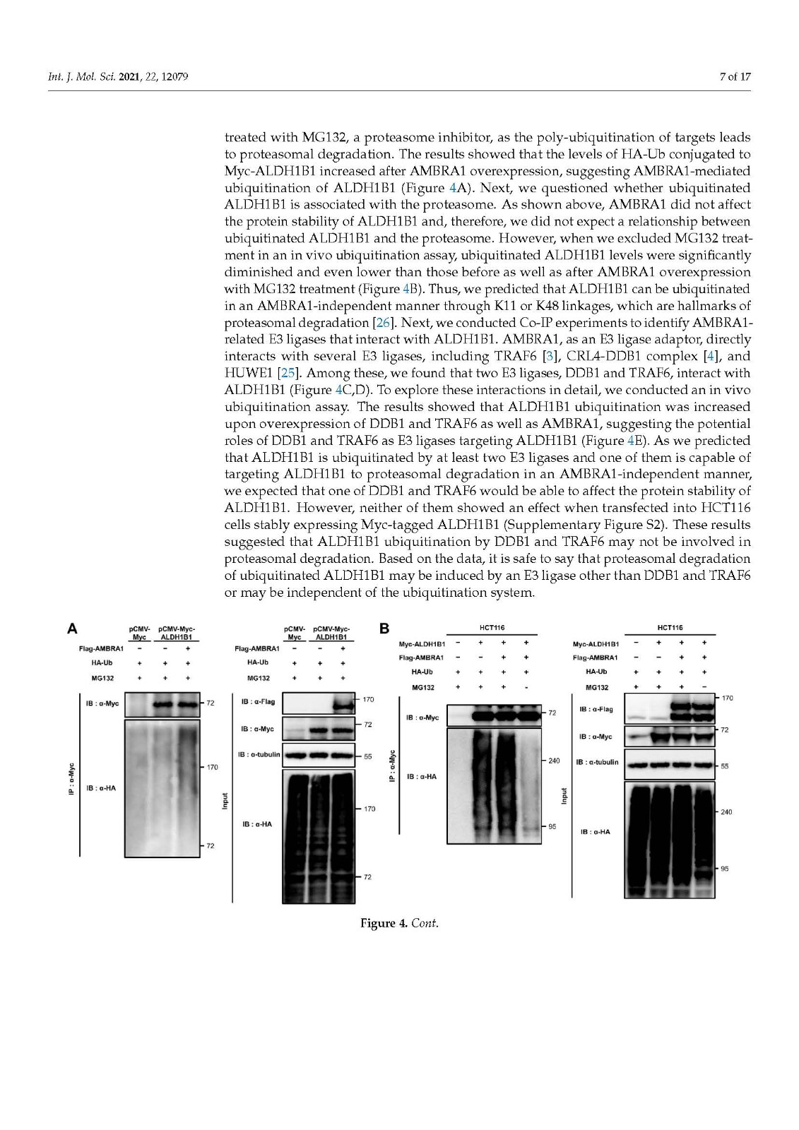 According to the Biological General Repository for Interaction Datasets (thebiogrid.org, Accessed 15 December 2020), ALDH1B1 has been identified as one of the AMBRA1-interacting proteins via affinity purification-mass spectrometry analysis of Flag-AMBRA1-transfected HEK293T human embryonic kidney cells [18]. However, the biological significance of the interaction between AMBRA1 and ALDH1B1 is not yet understood. Here, for the first time, we show that AMBRA1 downregulates the self-association and enzyme activity of ALDH1B1, and subsequently regulates CSC-associated Wnt/β-catenin signaling in an ALDH1B1-dependent manner. Mechanistically, AMBRA1 controls ALDH1B1 function via the ubiquitination of ALDH1B1 with K27- and K33-linked ubiquitin chains. Further, we found that TRAF6 and DDB1, an adaptor protein of the CRL4 complex, are able to ubiquitinate ALDH1B1 in an AMBRA1-independent fashion.