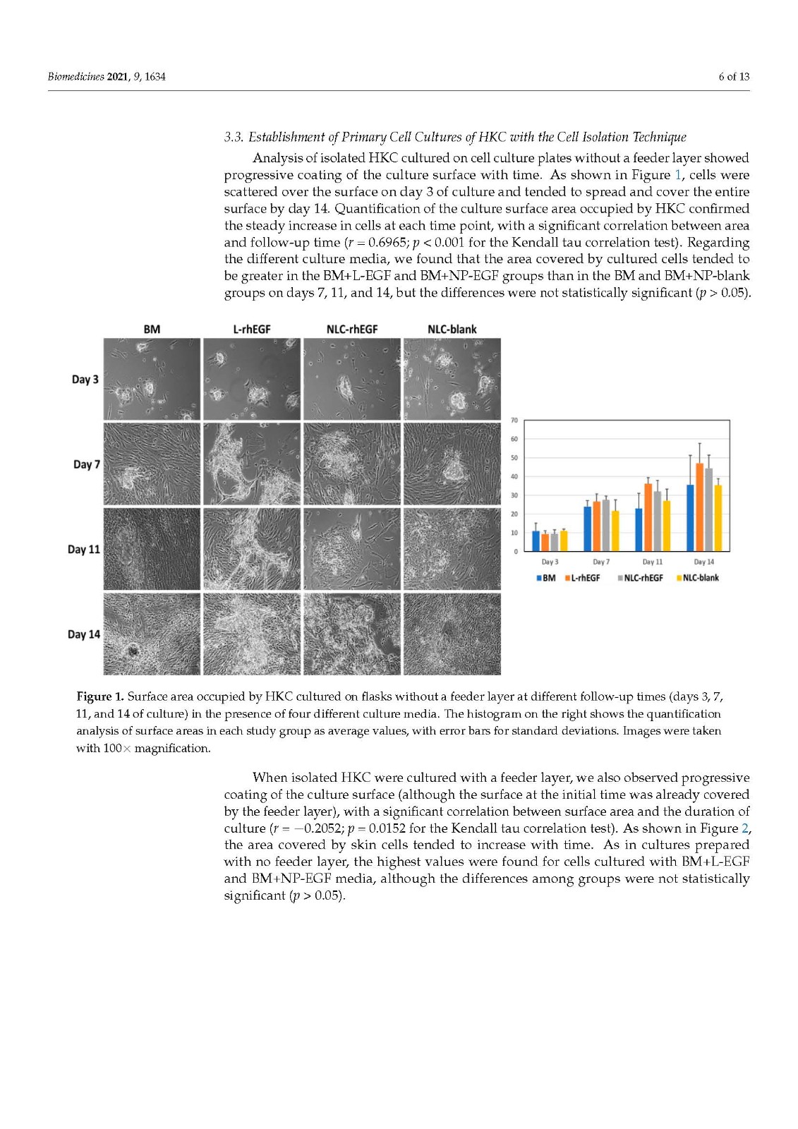 人类皮肤角质形成细胞原代培养物可以从皮肤活检标本中建立,培养基中含有上皮生长因子 (EGF)。虽然目前的方法是有效的,但需要优化以加快程序并在更短的时间内获得这些文化。在本研究中,我们评估了基于装载 EGF 的纳米结构脂质载体 (NLC) 的新型制剂的效果。首先,通过量化释放到培养基中的游离 DNA,在永生化皮肤角质形成细胞和角膜上皮细胞以及两种上皮癌细胞系中验证了含有重组人 EGF (NLC-rhEGF) 的 NLC 的生物安全性。然后我们用基础培养基 (BM) 和 BM 建立了人类皮肤角质形成细胞的原代细胞培养物,其中补充了 NLC-rhEGF、液体 EGF (L-rhEGF) 或单独的 NLC (NLC-空白)。结果表明,无论使用何种培养基,通过酶消化分离并在有或没有饲养层的情况下培养的细胞都具有相似的生长速率。然而,与 BM、L-rhEGF 或 NLC 空白相比,当使用 NLC-rhEGF 培养基时,外植体技术显示出更高的效率?;虮泶锓治霰砻?/span>NLC-rhEGF能够增加EGFR基因表达,以及与细胞角蛋白、细胞-细胞连接和角质细胞成熟和分化相关的其他基因的表达。总之,这些结果支持使用 NLC-rhEGF 来提高基于外植体的方法在有效生成用于组织工程的人角质形成细胞原代细胞培养物的效率。