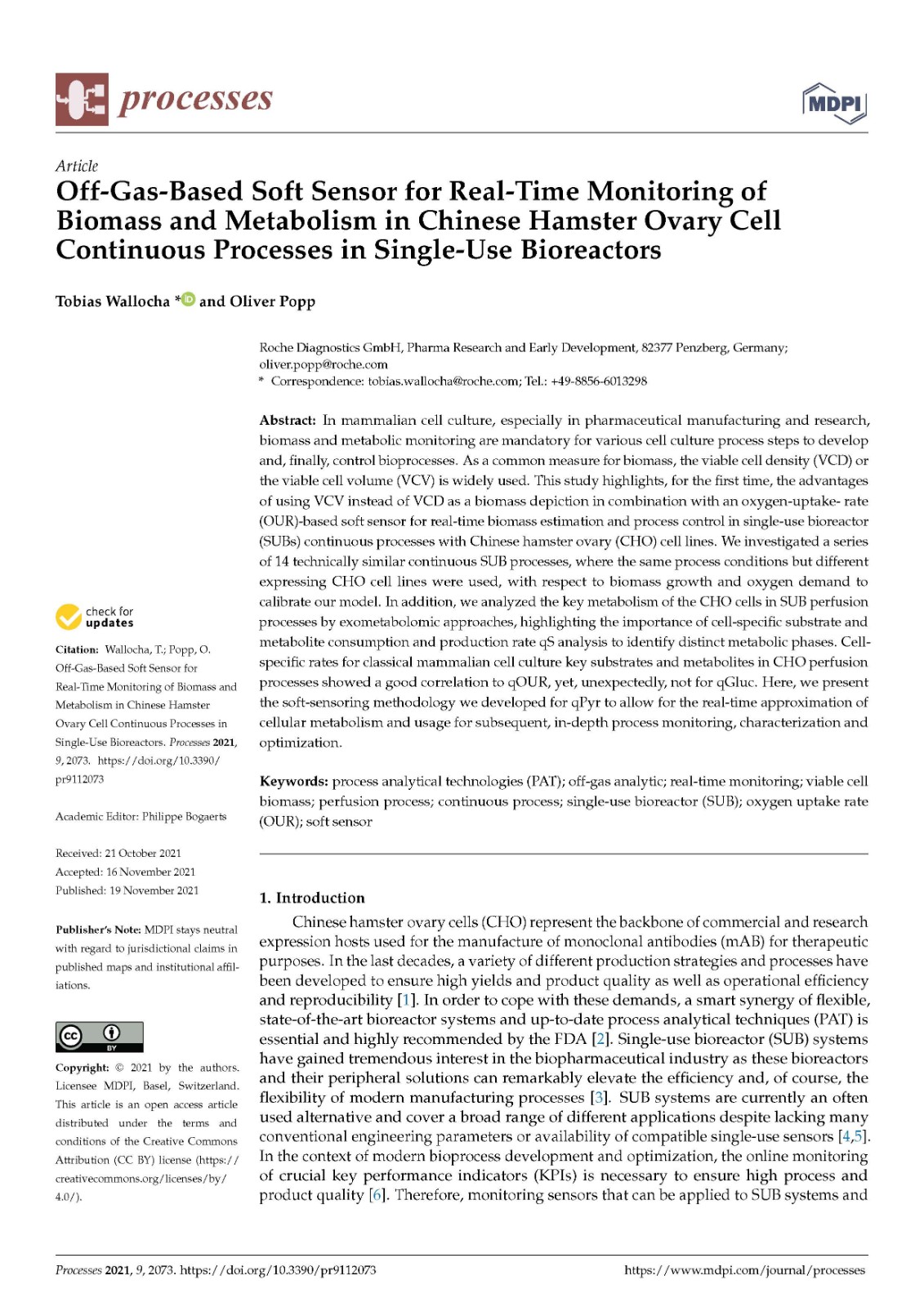 关键词:process analytical technologies (PAT),off-gas analytic,real-time monitoring,viable cell biomass, perfusion process,continuous process,single-use bioreactor (SUB),oxygen uptake rate (OUR),soft sensor过程分析技术(PAT),废气分析,实时监控,活细胞生物量,灌注过程,连续过程,一次性生物反应器(SUB),摄氧率 (OUR),软传感器