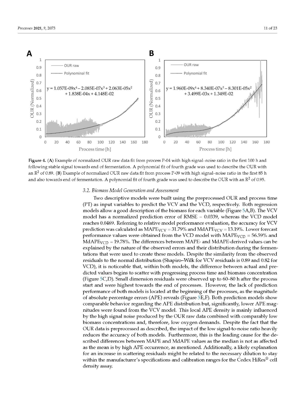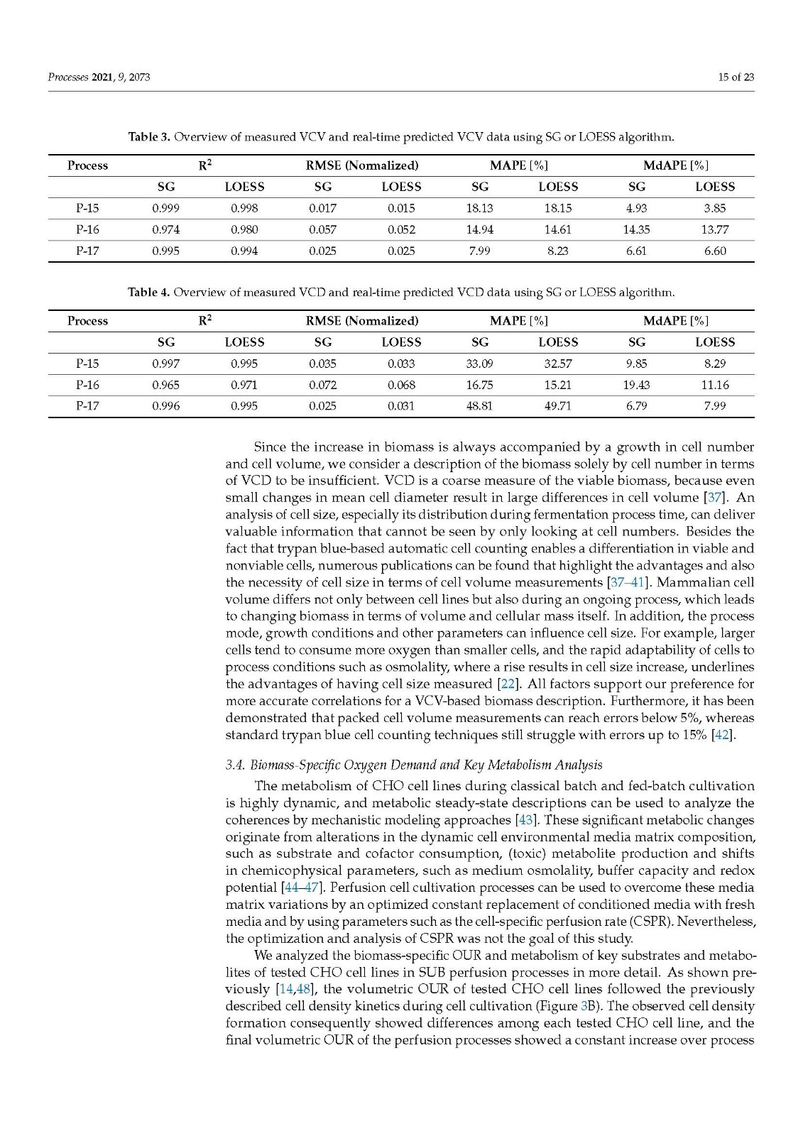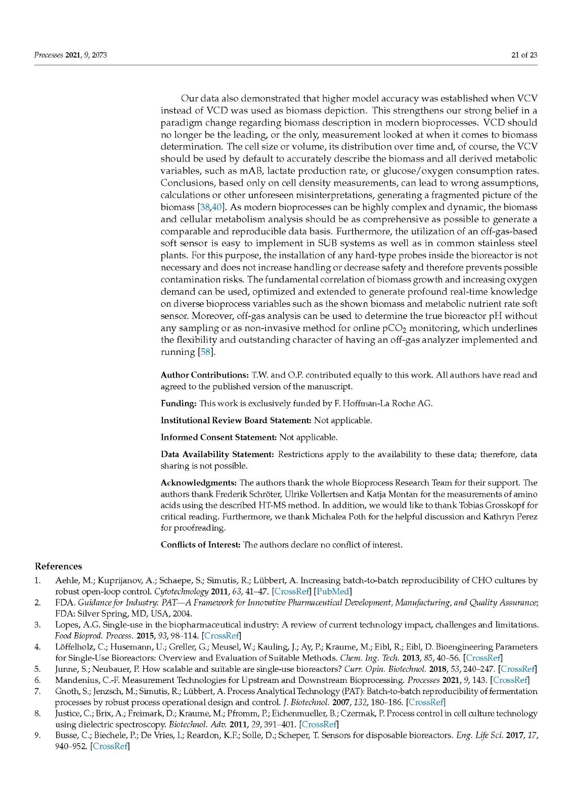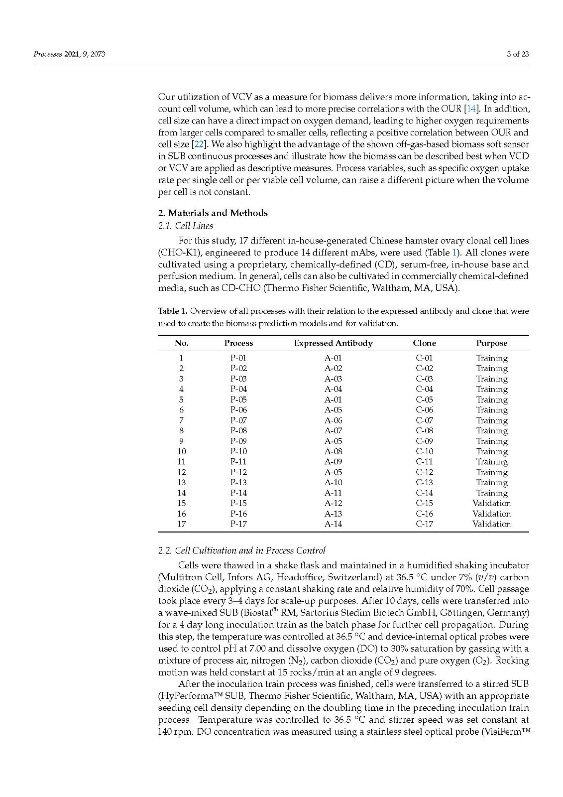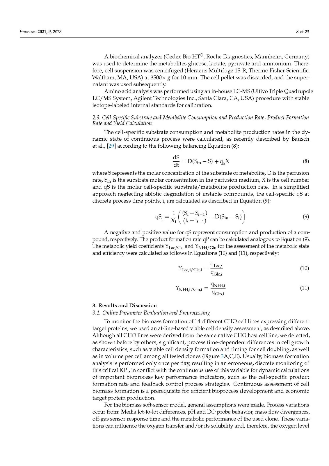 Our data also demonstrated that higher model accuracy was established when VCV instead of VCD was used as biomass depiction. This strengthens our strong belief in a paradigm change regarding biomass description in modern bioprocesses. VCD should no longer be the leading, or the only, measurement looked at when it comes to biomass determination. The cell size or volume, its distribution over time and, of course, the VCV should be used by default to accurately describe the biomass and all derived metabolic variables, such as mAB, lactate production rate, or glucose/oxygen consumption rates. Conclusions, based only on cell density measurements, can lead to wrong assumptions, calculations or other unforeseen misinterpretations, generating a fragmented picture of the biomass [38,40]. As modern bioprocesses can be highly complex and dynamic, the biomass and cellular metabolism analysis should be as comprehensive as possible to generate a comparable and reproducible data basis. Furthermore, the utilization of an off-gas-based soft sensor is easy to implement in SUB systems as well as in common stainless steel plants. For this purpose, the installation of any hard-type probes inside the bioreactor is not necessary and does not increase handling or decrease safety and therefore prevents possible contamination risks. The fundamental correlation of biomass growth and increasing oxygen demand can be used, optimized and extended to generate profound real-time knowledge on diverse bioprocess variables such as the shown biomass and metabolic nutrient rate soft sensor. Moreover, off-gas analysis can be used to determine the true bioreactor pH without any sampling or as non-invasive method for online pCO2 monitoring, which underlines the flexibility and outstanding character of having an off-gas analyzer implemented and running.