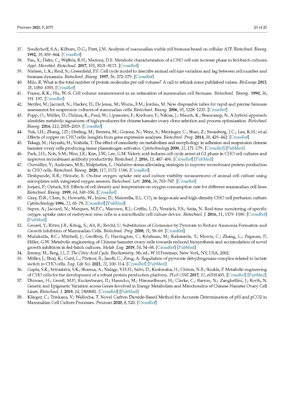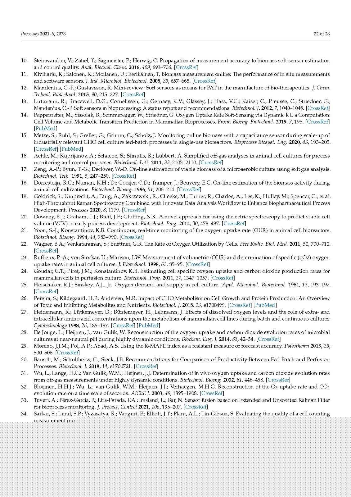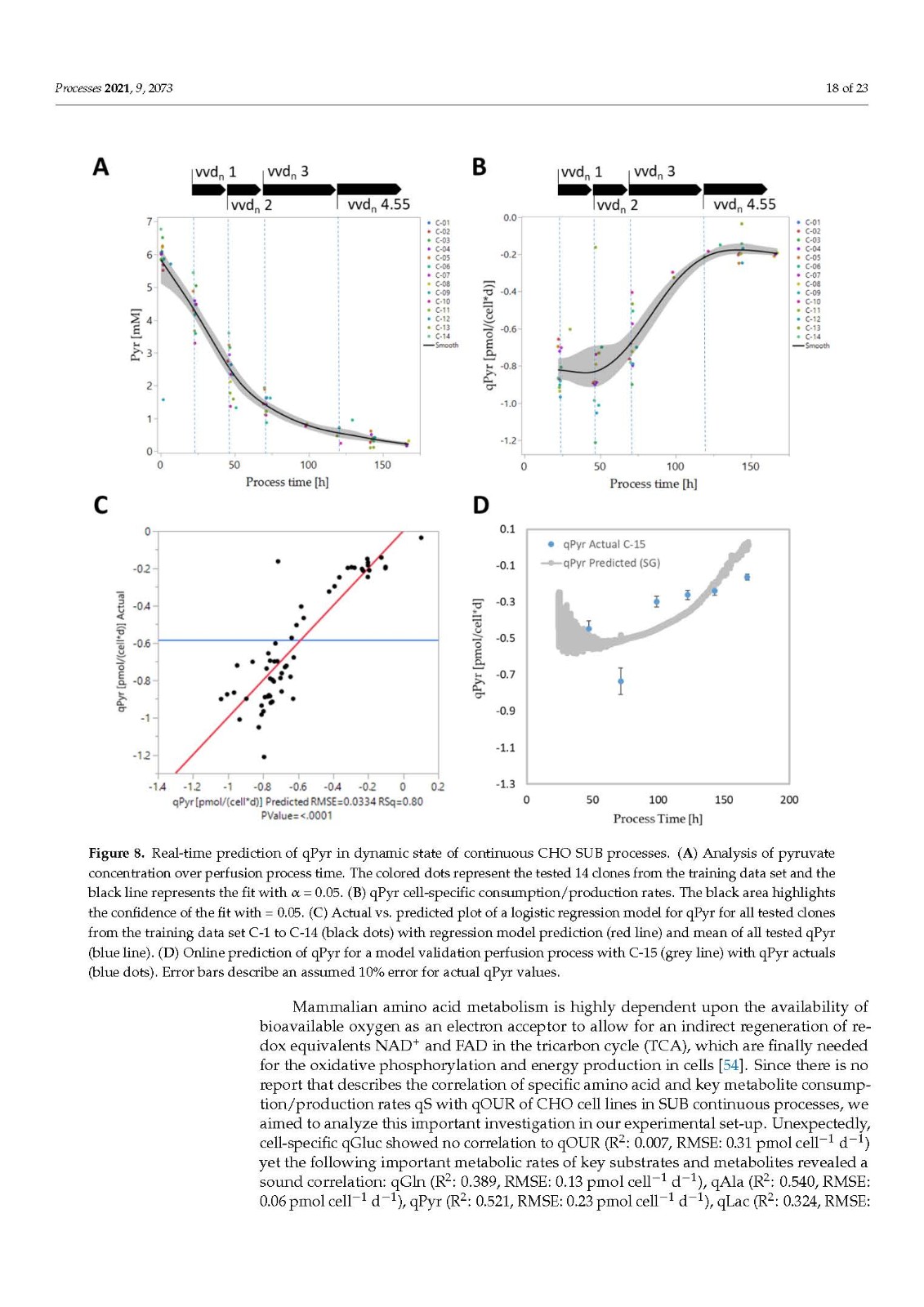 在哺乳动物细胞培养中,尤其是在药物制造和研究中,生物量和代谢监测对于开发和最终控制生物过程的各种细胞培养过程步骤是必不可少的。作为生物量的常用度量,活细胞密度 (VCD) 或活细胞体积 (VCV) 被广泛使用。本研究首次强调了使用 VCV 代替 VCD 作为生物量描述的优势,结合基于吸氧率 (OUR) 的软传感器,用于实时生物量估算和一次性过程控制中国仓鼠卵巢 (CHO) 细胞系的生物反应器 (SUB) 连续过程。我们研究了一系列 14 个技术上相似的连续 SUB 工艺,其中使用了相同的工艺条件但使用了不同的表达 CHO 细胞系,关于生物量增长和需氧量来校准我们的模型。此外,我们通过外代谢组学方法分析了 SUB 灌注过程中 CHO 细胞的关键代谢,强调了细胞特异性底物和代谢物消耗以及生产率 qS 分析对识别不同代谢阶段的重要性。CHO 灌注过程中经典哺乳动物细胞培养关键底物和代谢物的细胞特异性速率显示出与 qOUR 的良好相关性,但出人意料的是,与 qGluc 无关。在这里,我们介绍了我们为 qPyr 开发的软传感方法,以允许实时近似细胞代谢和使用情况,以便进行后续深入的过程监测、表征和优化。我们通过外代谢组学方法分析了 SUB 灌注过程中 CHO 细胞的关键代谢,强调了细胞特异性底物和代谢物消耗以及生产率 qS 分析对识别不同代谢阶段的重要性。CHO 灌注过程中经典哺乳动物细胞培养关键底物和代谢物的细胞特异性速率显示出与 qOUR 的良好相关性,但出人意料的是,与 qGluc 无关。在这里,我们介绍了我们为 qPyr 开发的软传感方法,以允许实时近似细胞代谢和使用情况,以便进行后续深入的过程监测、表征和优化。我们通过外代谢组学方法分析了 SUB 灌注过程中 CHO 细胞的关键代谢,强调了细胞特异性底物和代谢物消耗以及生产率 qS 分析对识别不同代谢阶段的重要性。CHO 灌注过程中经典哺乳动物细胞培养关键底物和代谢物的细胞特异性速率显示出与 qOUR 的良好相关性,但出人意料的是,与 qGluc 无关。在这里,我们介绍了我们为 qPyr 开发的软传感方法,以允许实时近似细胞代谢和使用情况,以便进行后续深入的过程监测、表征和优化。强调细胞特异性底物和代谢物消耗和生产率 qS 分析的重要性,以确定不同的代谢阶段。CHO 灌注过程中经典哺乳动物细胞培养关键底物和代谢物的细胞特异性速率显示出与 qOUR 的良好相关性,但出人意料的是,与 qGluc 无关。在这里,我们介绍了我们为 qPyr 开发的软传感方法,以允许实时近似细胞代谢和使用情况,以便进行后续深入的过程监测、表征和优化。强调细胞特异性底物和代谢物消耗和生产率 qS 分析的重要性,以确定不同的代谢阶段。CHO 灌注过程中经典哺乳动物细胞培养关键底物和代谢物的细胞特异性速率显示出与 qOUR 的良好相关性,但出人意料的是,与 qGluc 无关。在这里,我们介绍了我们为 qPyr 开发的软传感方法,以允许实时近似细胞代谢和使用情况,以便进行后续深入的过程监测、表征和优化。