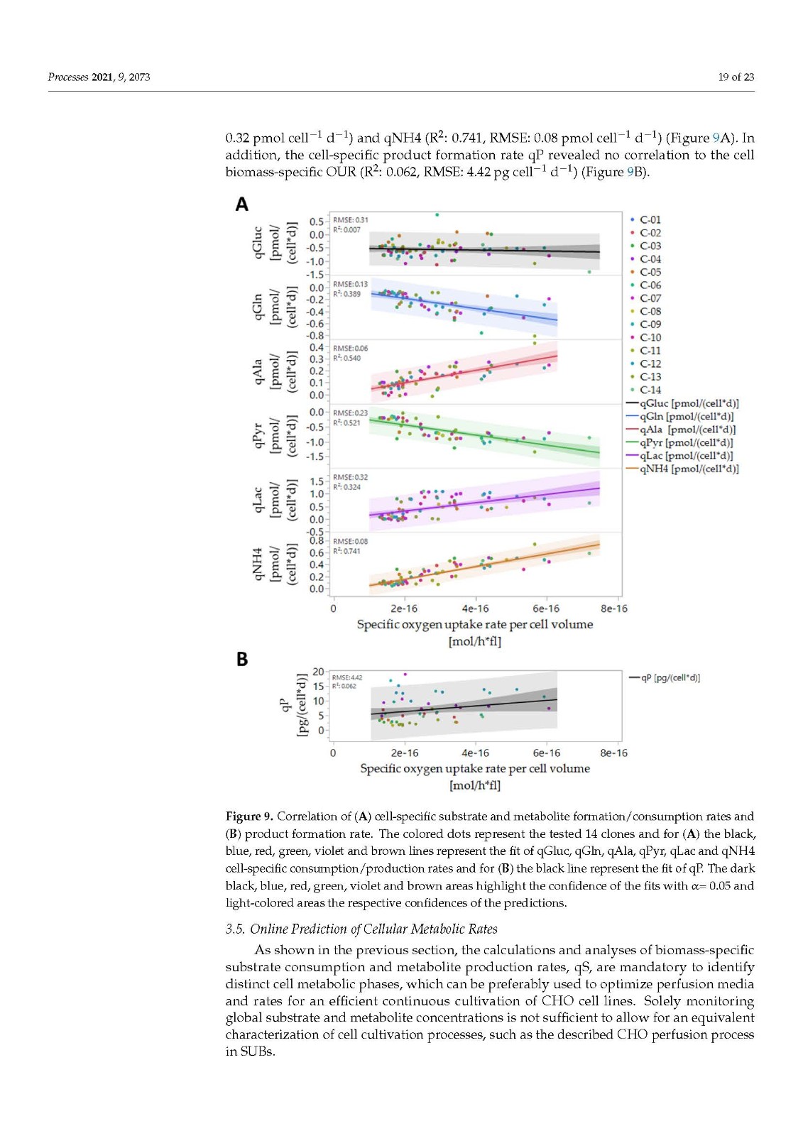 我们的数据还表明,当使用 VCV 代替 VCD 作为生物量描述时,建立了更高的模型精度。这增强了我们对现代生物过程中生物质描述范式变化的坚定信念。在生物量测定方面,VCD 不应再成为主要或唯一的测量方法。默认情况下,应使用细胞大小或体积、其随时间的分布以及 VCV 来准确描述生物量和所有衍生的代谢变量,例如 mAB、乳酸生产率或葡萄糖/氧气消耗率。仅基于细胞密度测量的结论可能会导致错误的假设、计算或其他不可预见的误解,从而生成生物量的碎片化图片。由于现代生物过程可能非常复杂和动态,生物量和细胞代谢分析应尽可能全面,以生成可比较和可重复的数据基础。此外,基于废气的软传感器的使用很容易在 SUB 系统以及普通不锈钢工厂中实施。为此,不需要在生物反应器内安装任何硬型探针,并且不会增加操作或降低安全性,因此可以防止可能的污染风险??梢允褂?、优化和扩展生物量增长和增加的需氧量之间的基本相关性,以生成有关各种生物过程变量的深刻实时知识,例如所示的生物量和代谢营养率软传感器。而且,监测,这强调了实施和运行废气分析仪的灵活性和突出特点。