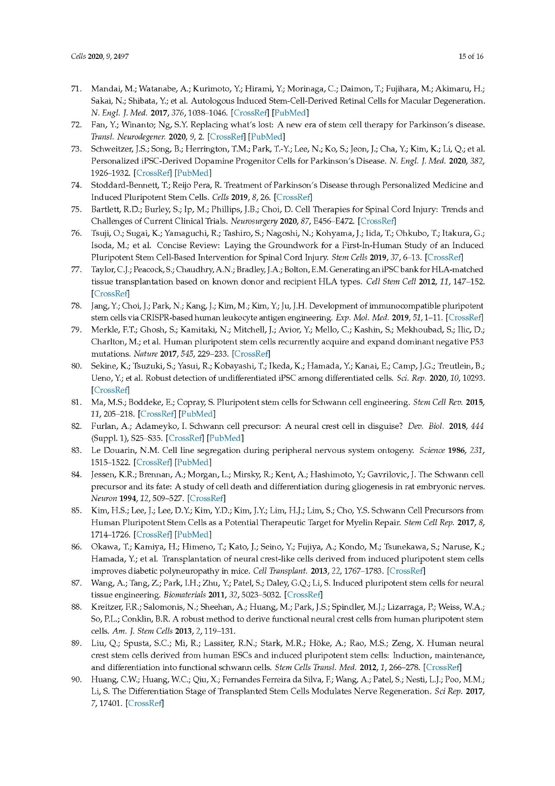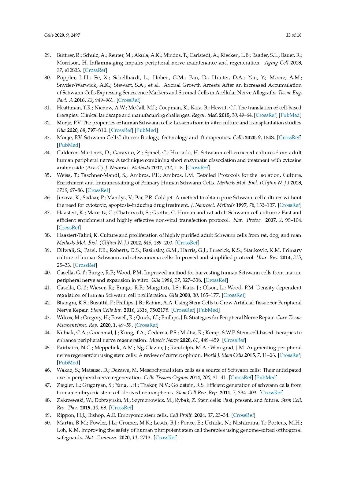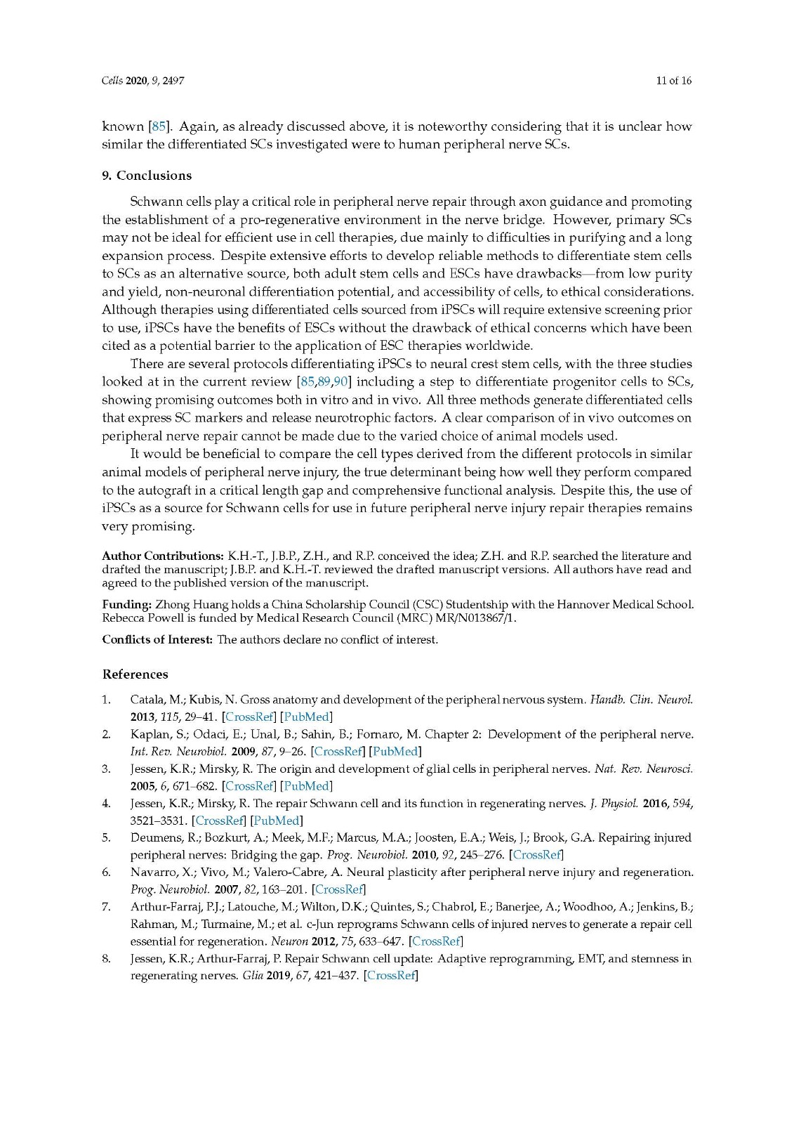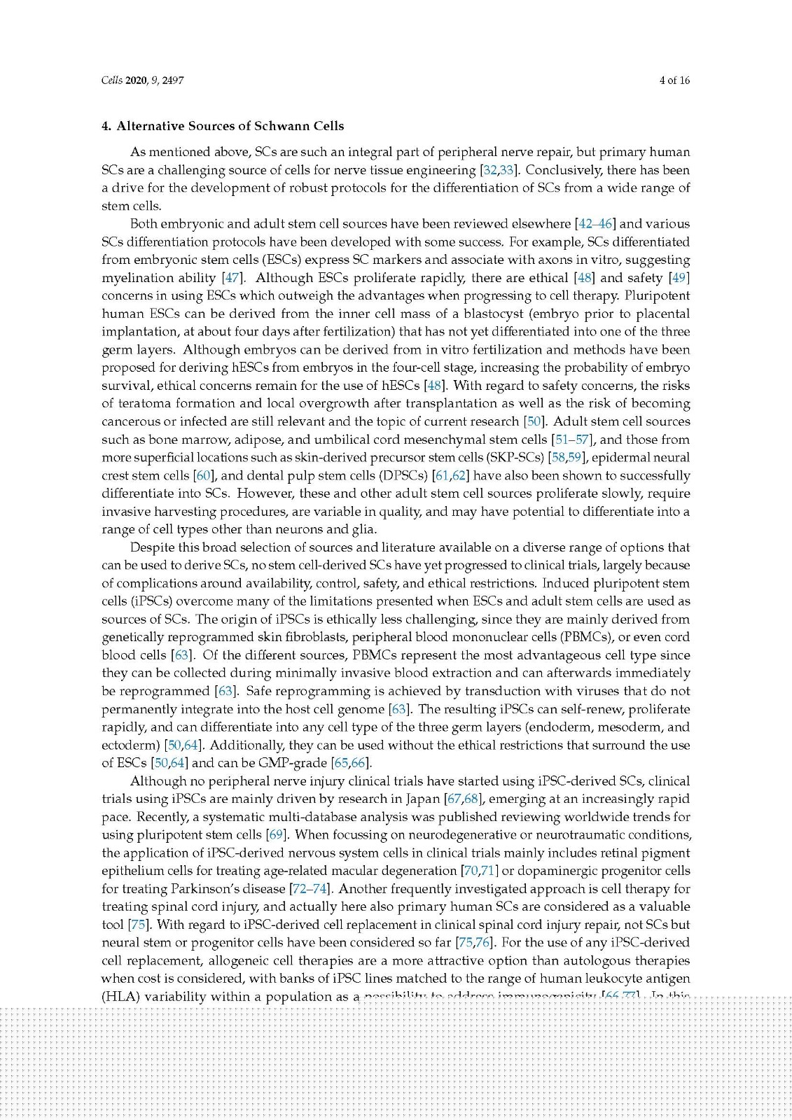 Schwann cells play a critical role in peripheral nerve repair through axon guidance and promoting the establishment of a pro-regenerative environment in the nerve bridge. However, primary SCs may not be ideal for efficient use in cell therapies, due mainly to difficulties in purifying and a long expansion process. Despite extensive efforts to develop reliable methods to differentiate stem cells to SCs as an alternative source, both adult stem cells and ESCs have drawbacks—from low purity and yield, non-neuronal differentiation potential, and accessibility of cells, to ethical considerations. Although therapies using differentiated cells sourced from iPSCs will require extensive screening prior to use, iPSCs have the benefits of ESCs without the drawback of ethical concerns which have been cited as a potential barrier to the application of ESC therapies worldwide.