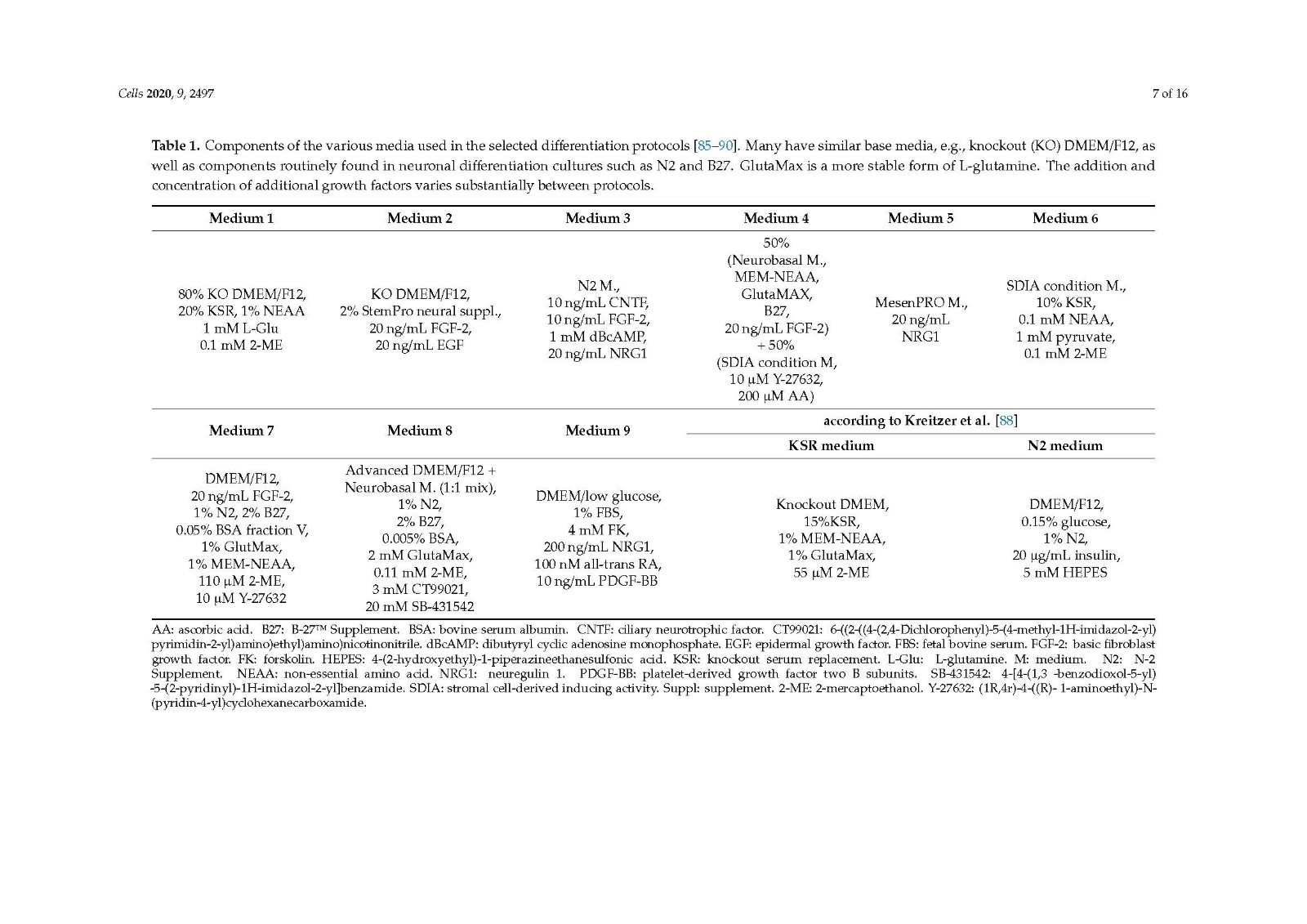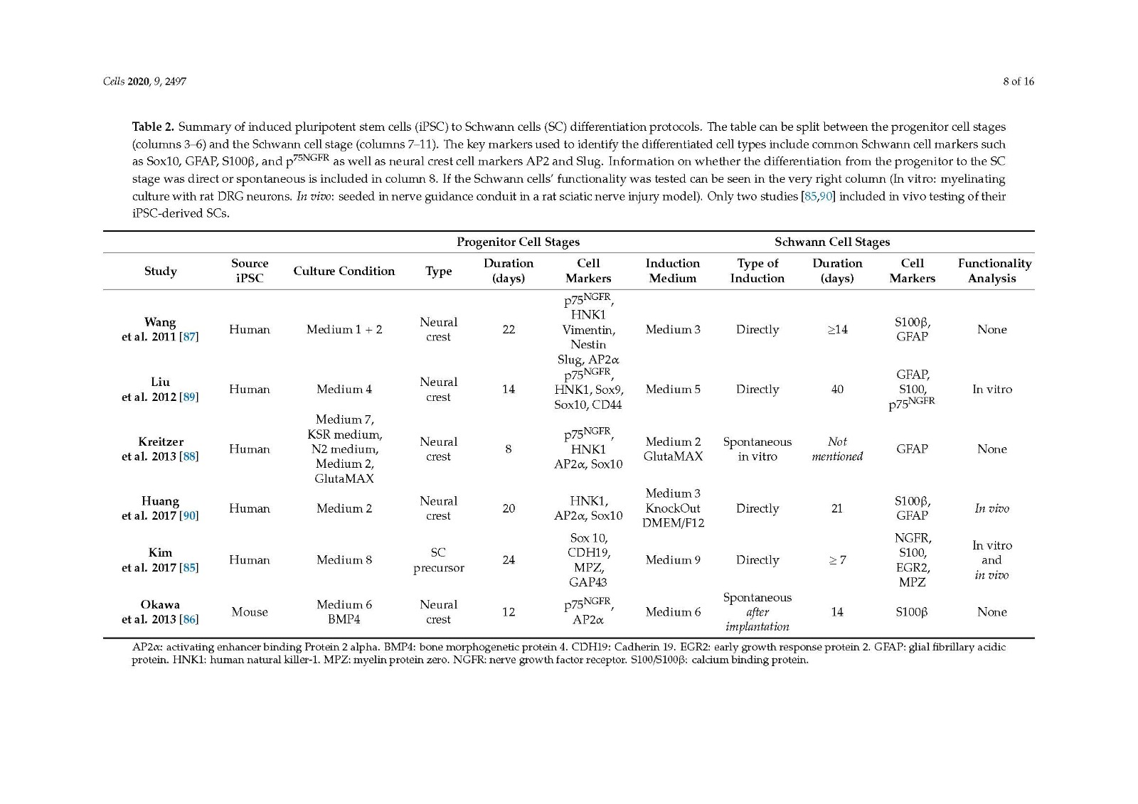 There are several protocols differentiating iPSCs to neural crest stem cells, with the three studies looked at in the current review [85,89,90] including a step to differentiate progenitor cells to SCs, showing promising outcomes both in vitro and in vivo. All three methods generate differentiated cells that express SC markers and release neurotrophic factors. A clear comparison of in vivo outcomes on peripheral nerve repair cannot be made due to the varied choice of animal models used.