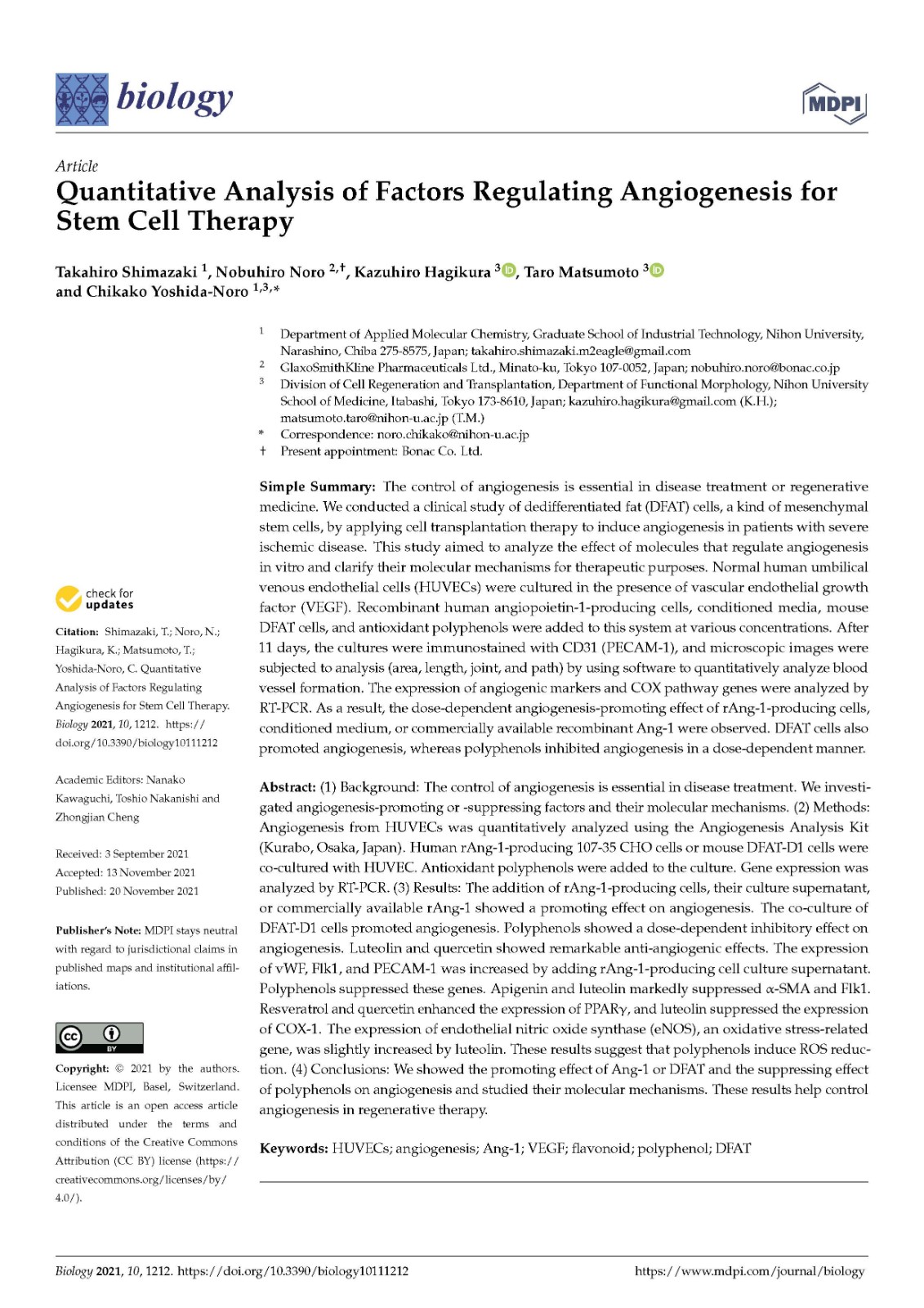 本研究旨在定量分析促进或抑制血管生成的分子的作用并阐明其调控机制?;谑低枷穹治龅慕峁?,研究了 Ang-1 和多酚对血管组织形成的影响。结果,我们可以阐明Ang-1的浓度依赖性血管生成促进作用和四种多酚的浓度依赖性血管生成抑制作用。另一方面,与 DFAT 细胞的共培养也显示出促进血管生成的作用。我们希望通过本研究阐明的因素控制血管生成,并将其应用于再生血管医学。