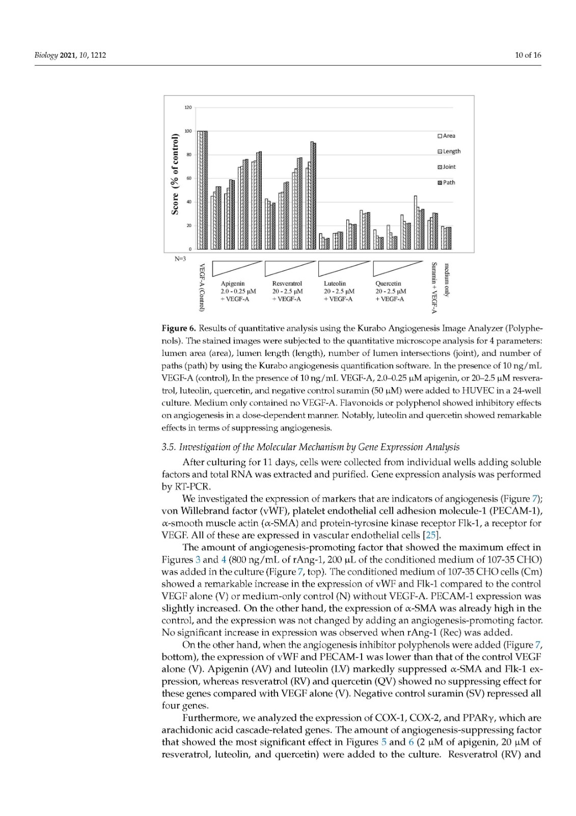 Polyphenols apigenin and luteolin (Fujifilm Wako Chemicals) were dissolved in methanol, resveratrol, and quercetin (Fujifilm Wako Chemicals) dissolved in ethanol. Recombinant Ang-1 protein was purchased from R&D Systems. CD31 antibody (tube formation indicator), VEGF-A (positive control), and suramin (negative control) were purchased from Kurabo.