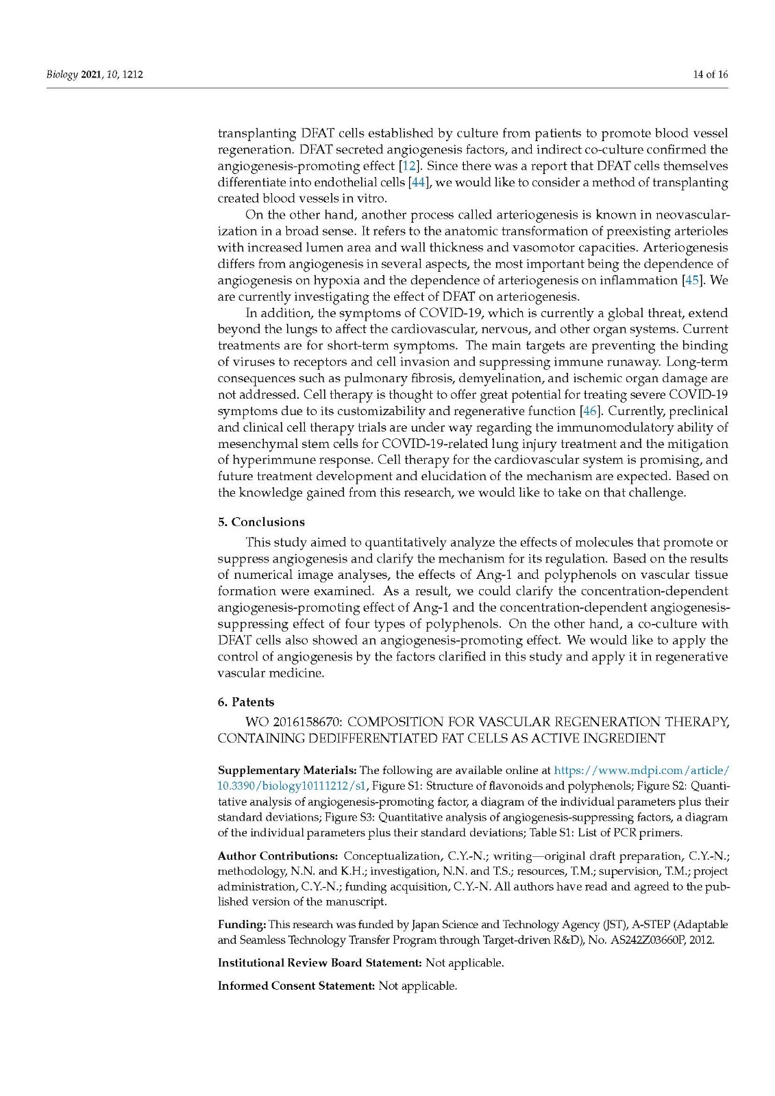 血管生成的控制在疾病治疗或再生医学中是必不可少的。我们通过应用细胞移植疗法诱导严重缺血性疾病患者的血管生成,对去分化脂肪 (DFAT) 细胞(一种间充质干细胞)进行了临床研究。本研究旨在分析体外调节血管生成的分子的作用,并阐明其用于治疗目的的分子机制。在血管内皮生长因子 (VEGF) 存在下培养正常人脐静脉内皮细胞 (HUVEC)。将产生不同浓度的重组人血管生成素 1 细胞、条件培养基、小鼠 DFAT 细胞和抗氧化多酚添加到该系统中。11 天后,用 CD31 (PECAM-1) 对培养物进行免疫染色,通过软件对显微图像进行分析(面积、长度、关节、路径),对血管形成进行定量分析。通过RT-PCR分析血管生成标志物和COX通路基因的表达。结果,观察到了产生 rAng-1 的细胞、条件培养基或市售重组 Ang-1 的剂量依赖性血管生成促进作用。DFAT 细胞还促进血管生成,而多酚以剂量依赖性方式抑制血管生成?;蚩缮坦旱闹刈?/span>Ang-1被观察到。DFAT 细胞还促进血管生成,而多酚以剂量依赖性方式抑制血管生成?;蚩缮坦旱闹刈?/span>Ang-1被观察到。DFAT 细胞还促进血管生成,而多酚以剂量依赖性方式抑制血管生成。